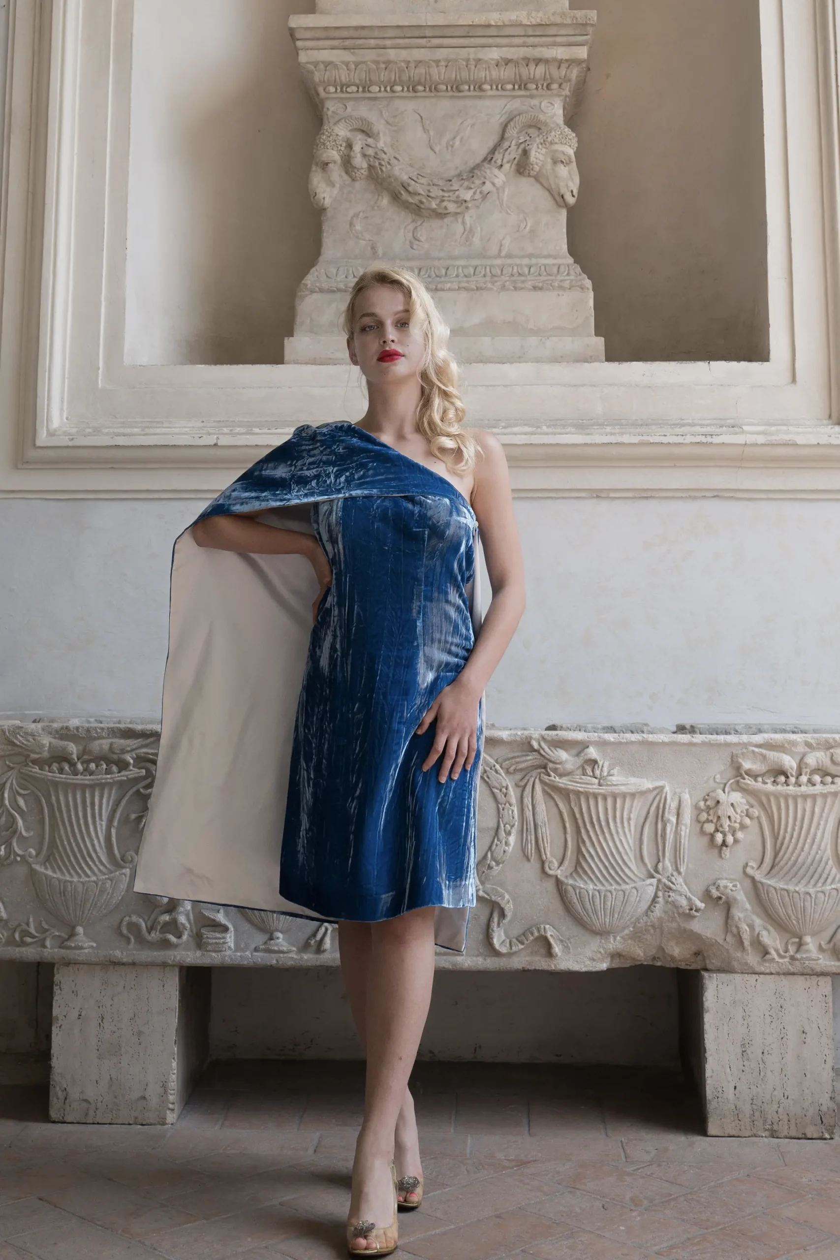 Abito in velluto monospalla con mantella blu e fodera in raso di seta