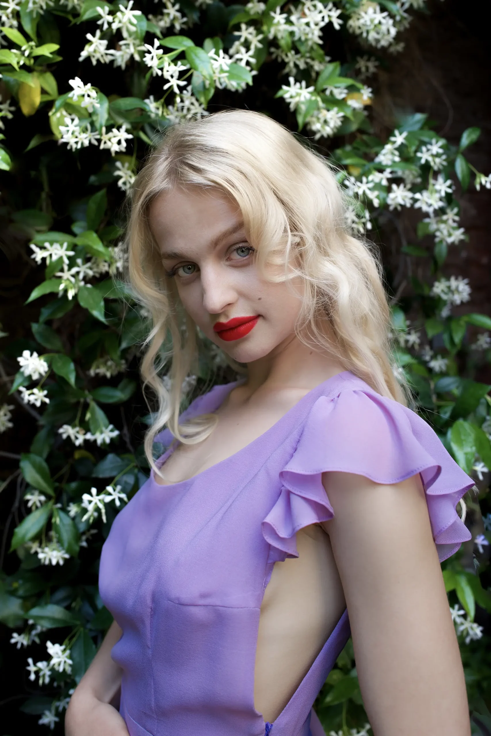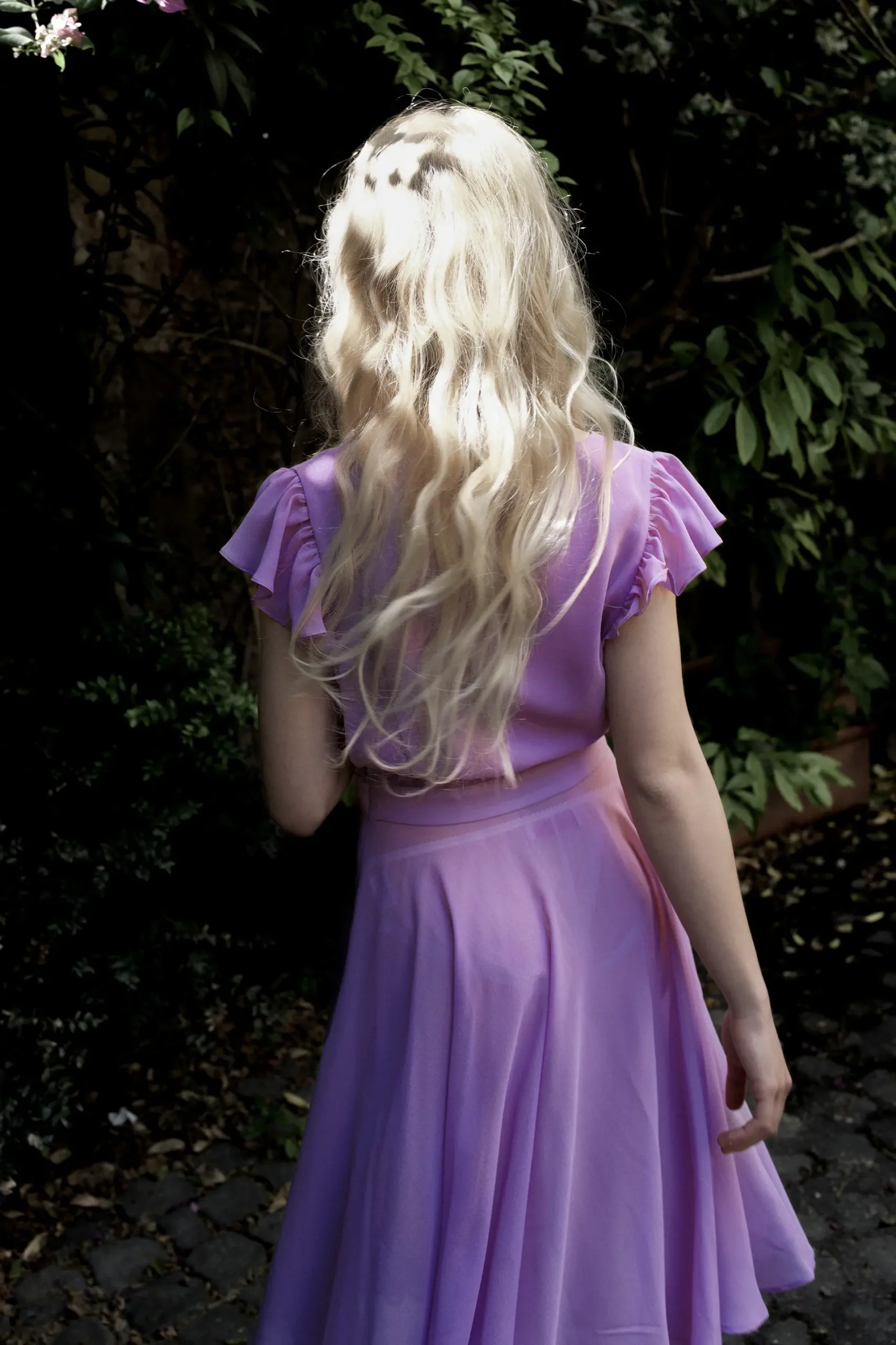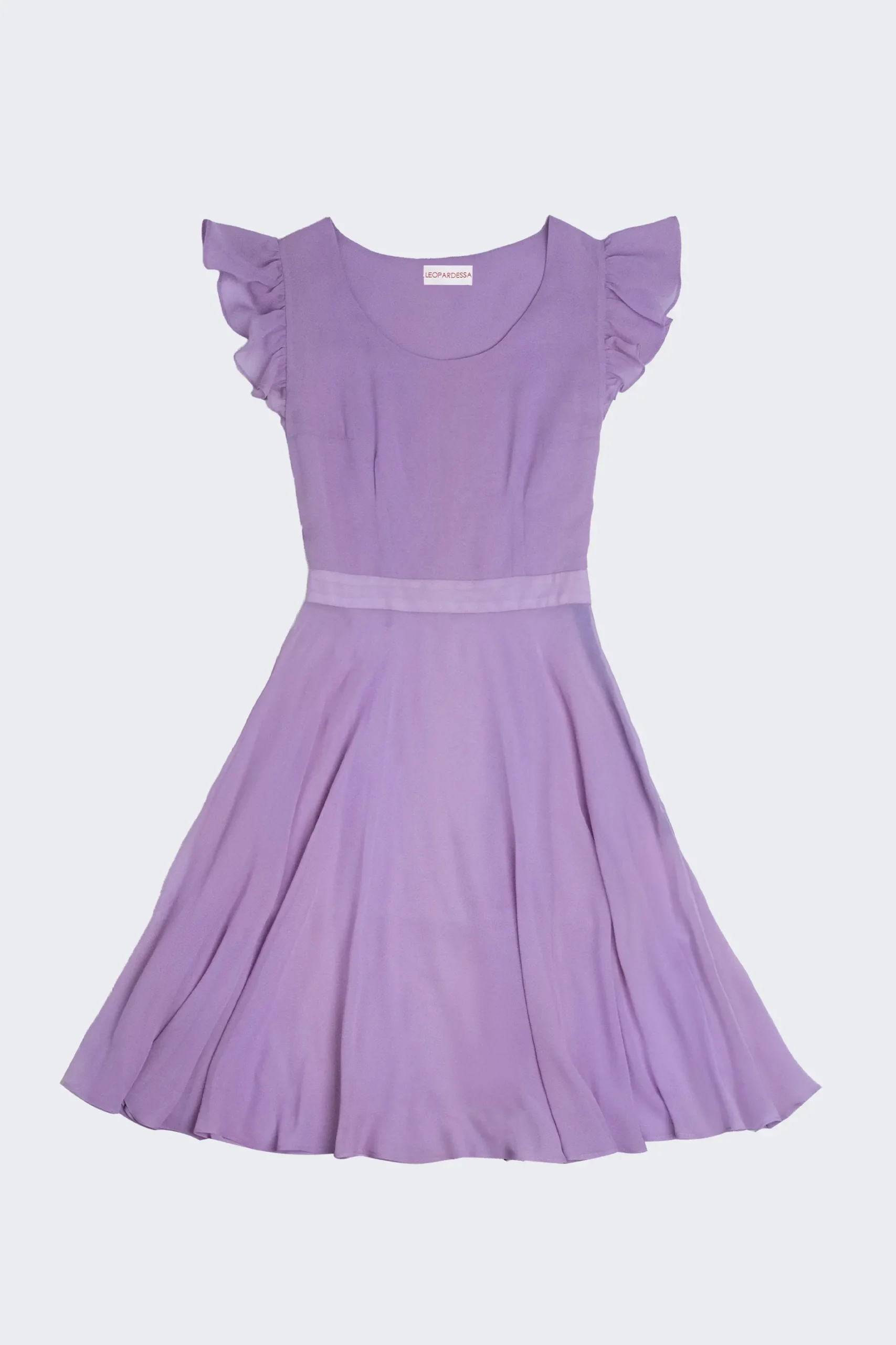 Abito grembiule lilla in chiffon con spacchi laterali e balze