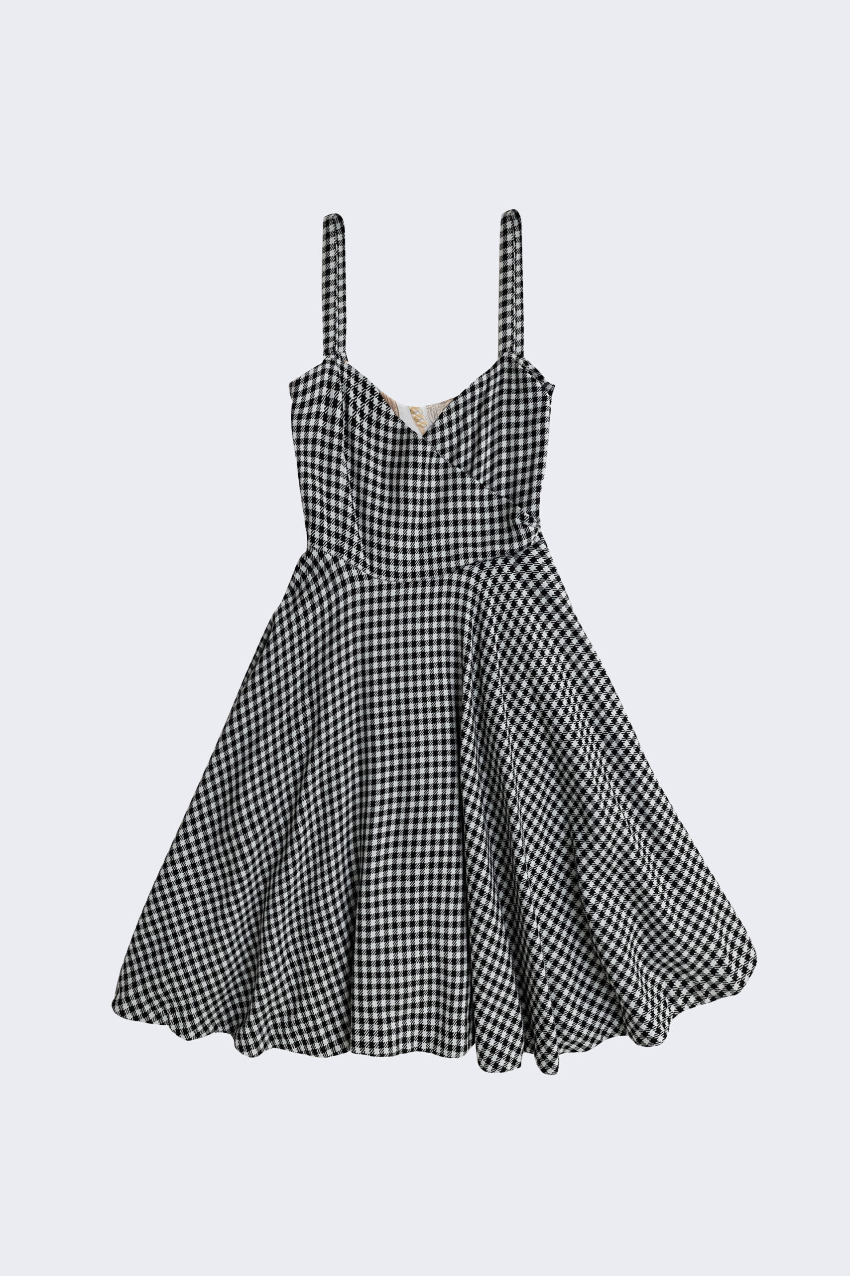 Abito in lana pied-de-poule dal fascino senza tempo, con una raffinata gonna a ruota che dona movimento e eleganza. Perfetto per un look sofisticato e versatile, ideale per shooting fotografici e progetti artistici che richiedono un tocco di stile classico e ricercato.