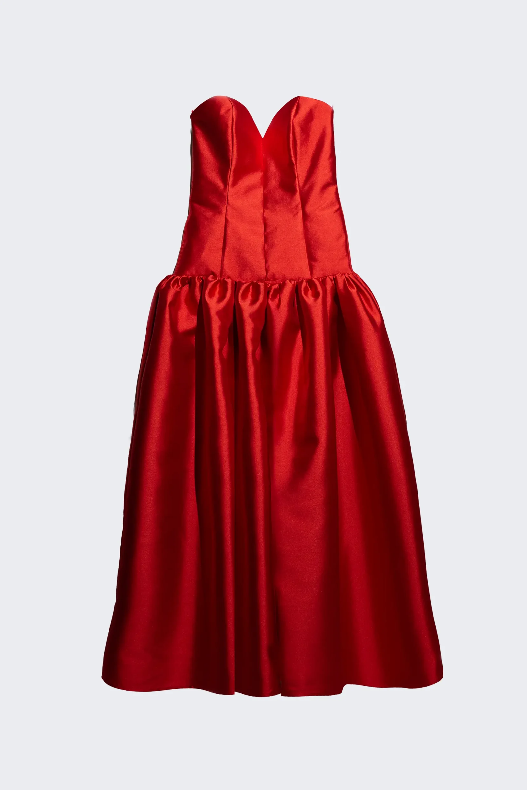 Abito bustino rosso in mikado con corsetto e lunghezza alla caviglia