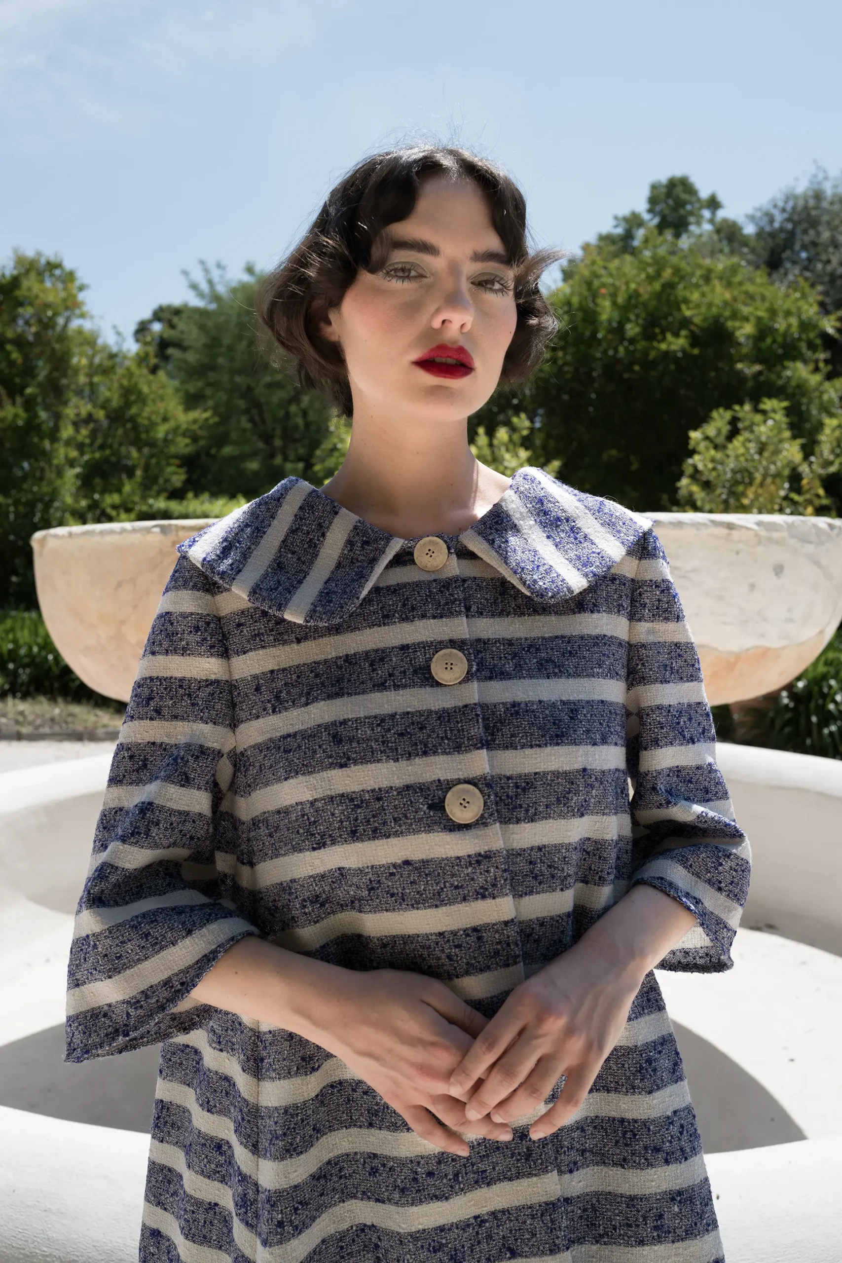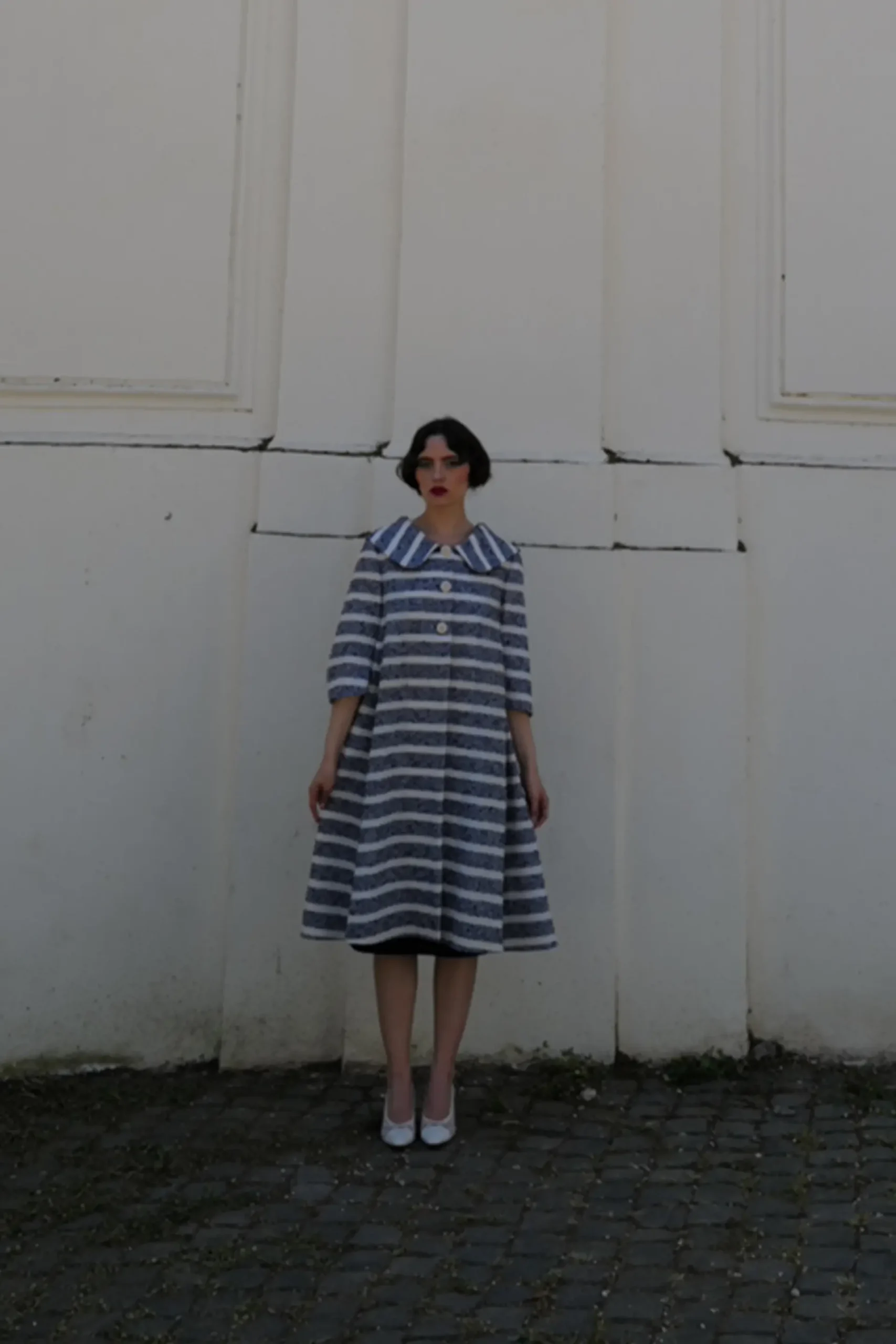 Cappotto in lana antica a righe blu e bianche – pezzo unico