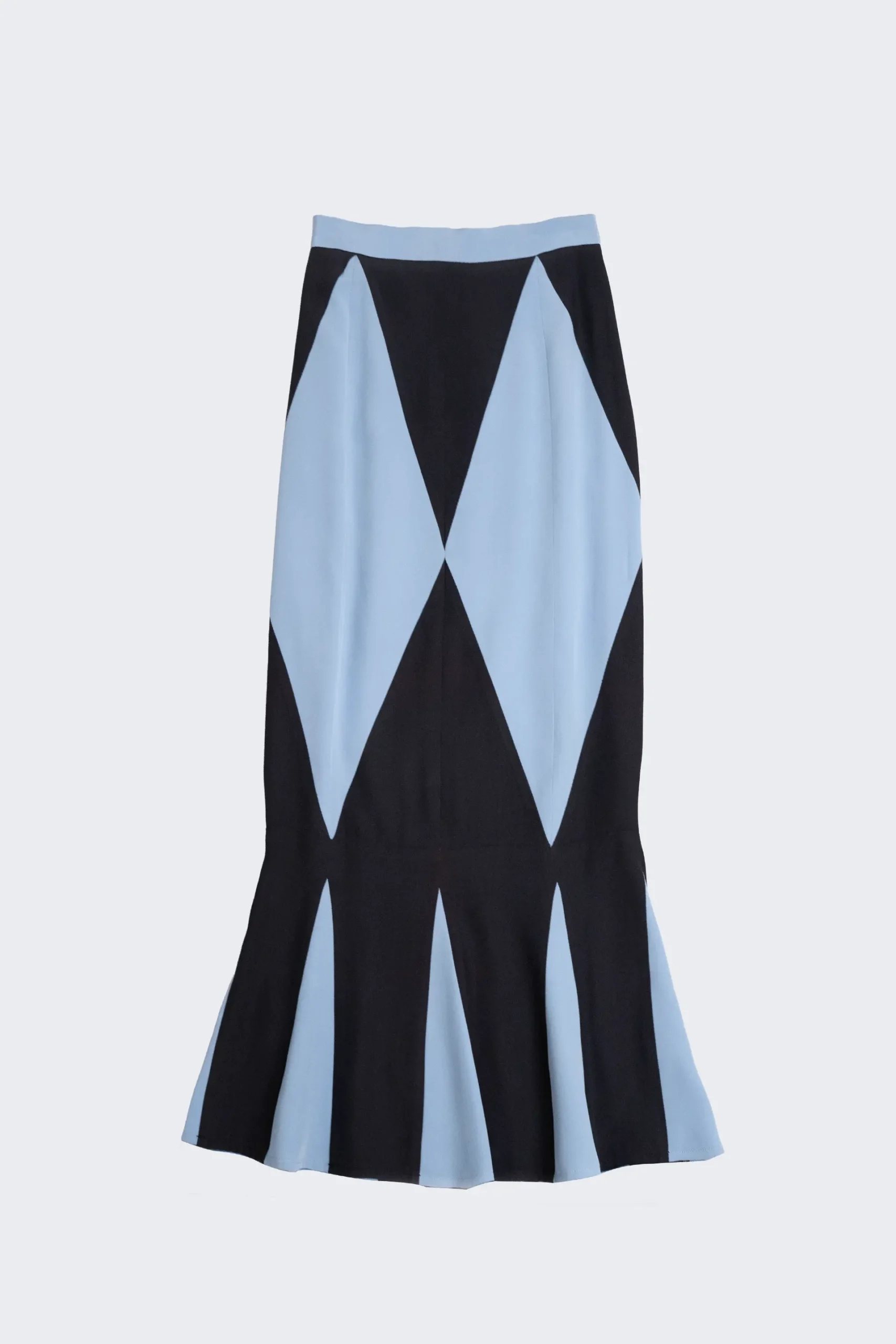 Gonna lunga fantasia a rombi in cadi di seta e tessuto antico. Ricerca grafica, fluidità e tradizione sartoriale.