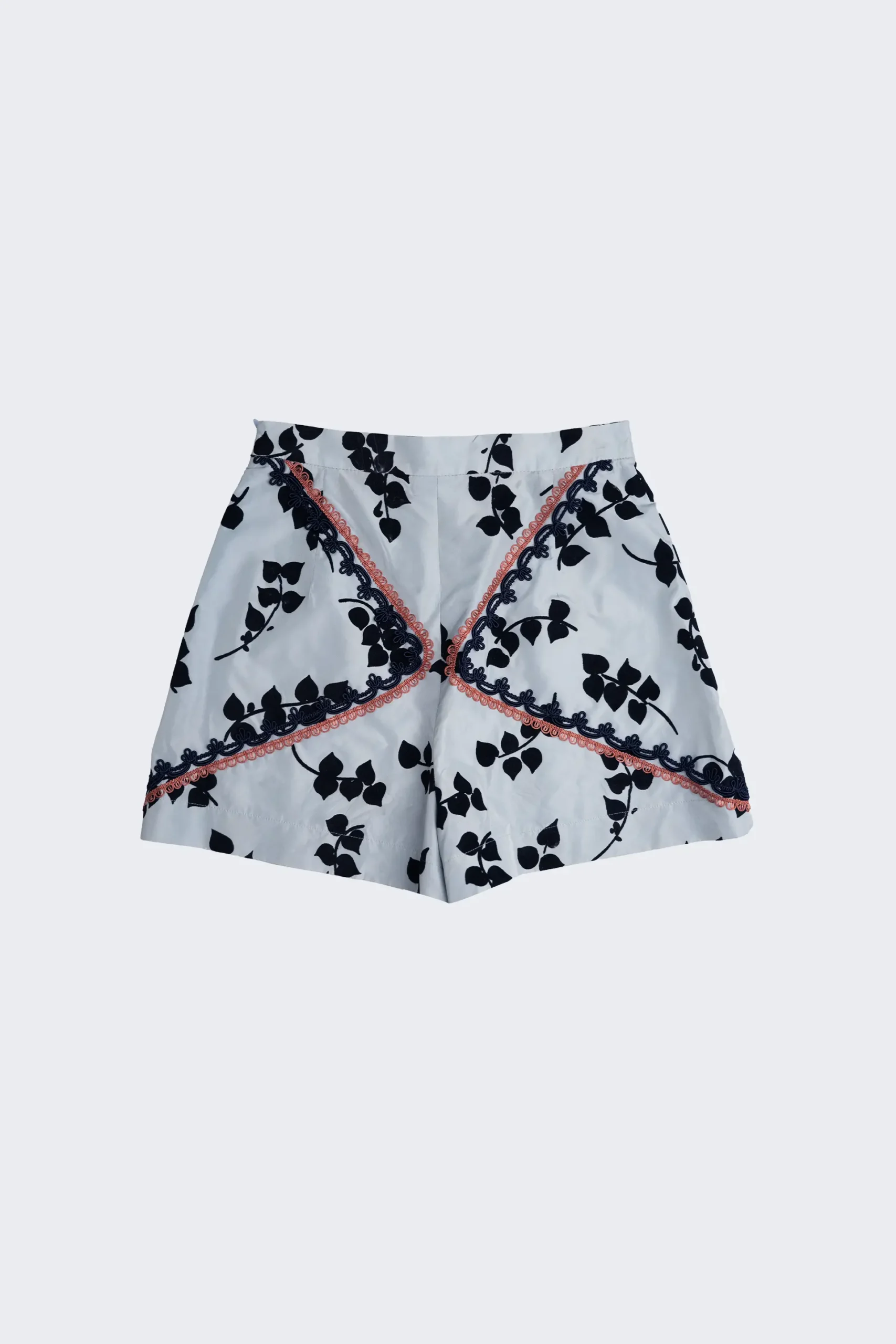 Pantaloncino in tessuto antico e taffetas con rilievi in velluto. Un equilibrio armonico tra tradizione artigianale e sensibilità contemporanea.