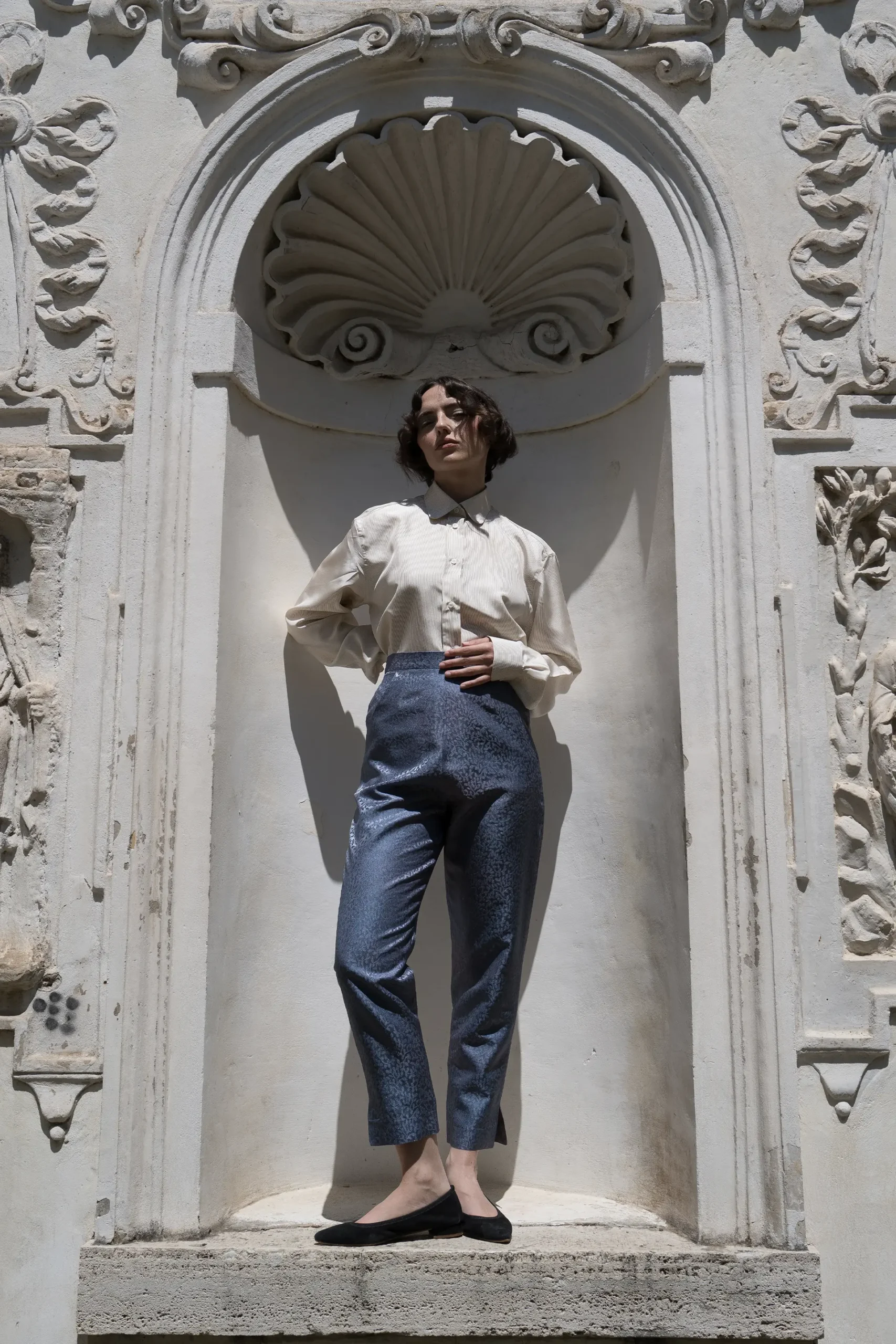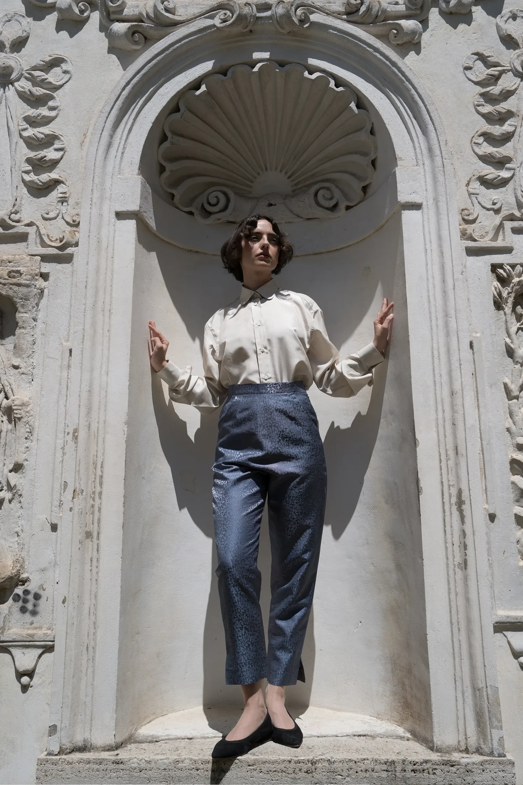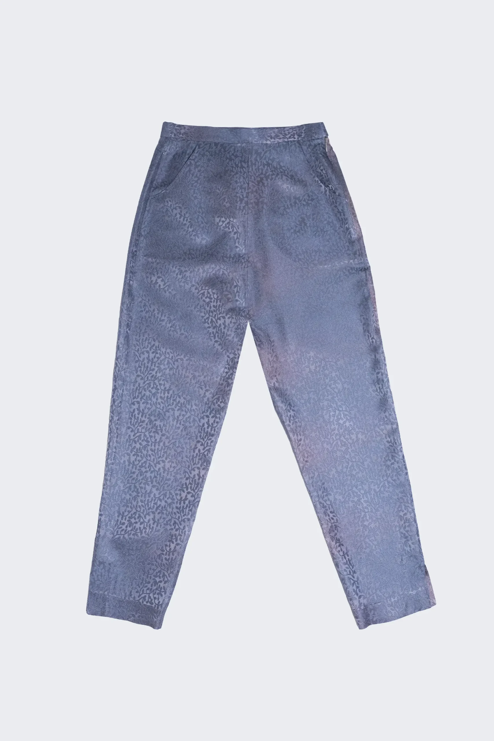 Pantalone in tessuto antico anni ’50 in raso con fantasia foglie